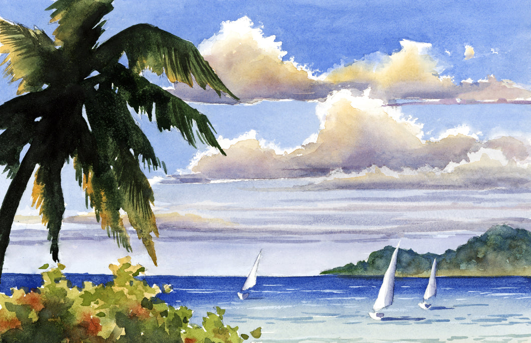 Are you ready for a tropical getaway? Grab your brush! This Watercolor Mastery Workshop will take you away to a beautiful remote tropical location complete with palm trees and sailboats!